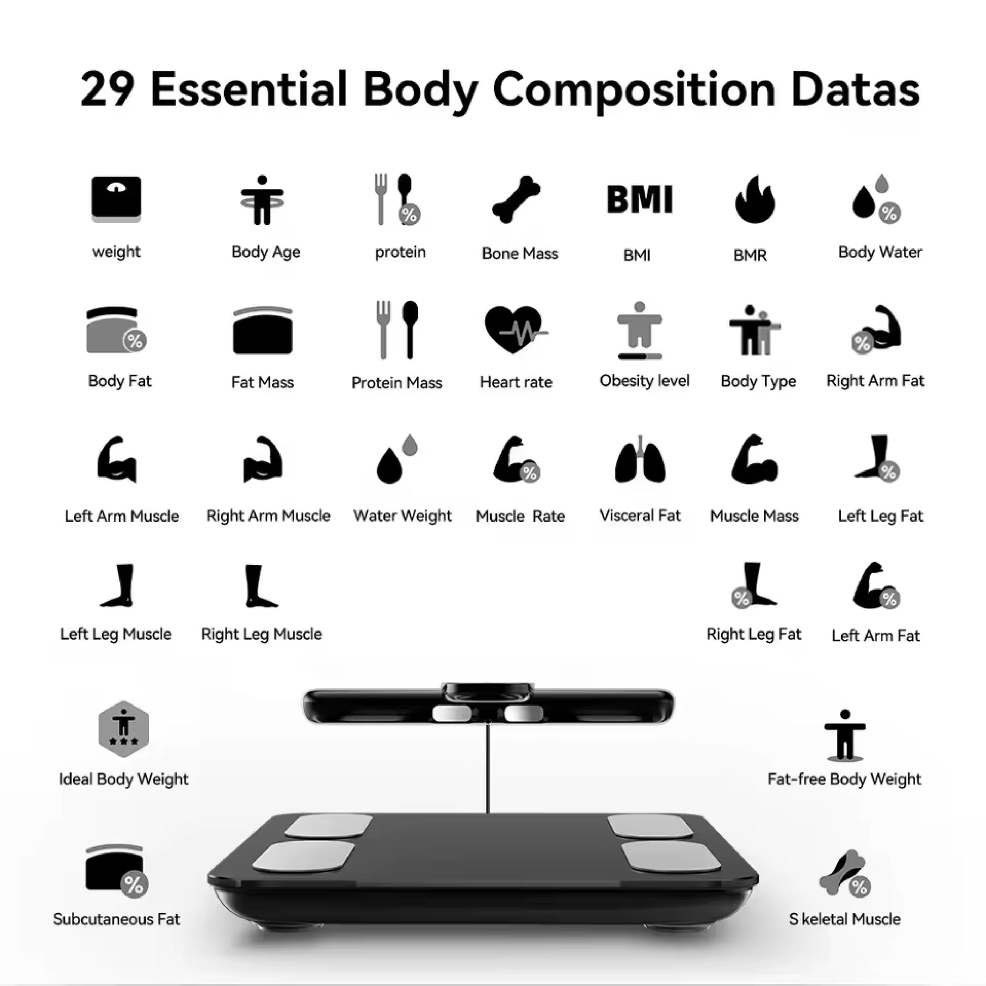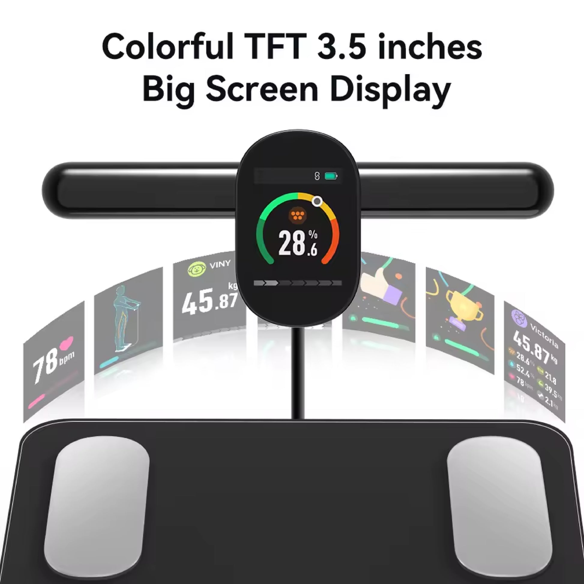 This 8 Electrodes Digital Smart BMI Scale features ITO technology, a 396lb capacity, and tempered glass construction. It supports body fat, water content, calorie, and weight measuring with high-precision sensors. Equipped with VA big display and a rechargeable lithium battery via Type C port. Certified by CE, RoHS, FCC, and REACH for compliance with global safety standards, ensuring market access and buyer trust.