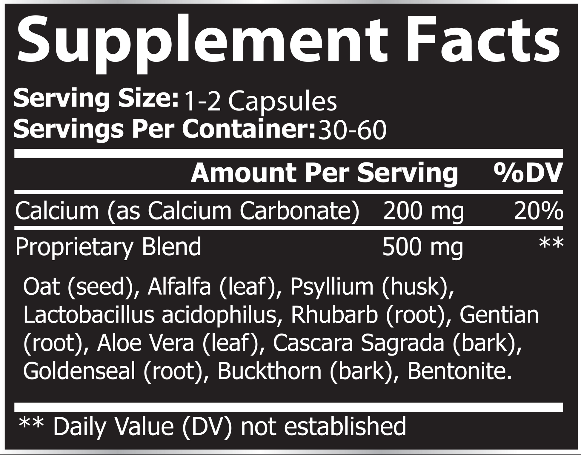 Some of the key ingredients include Oat see, Alfalfa leaf, Psyllium Husk, Lacto-bacillus acidophilus, Rhubarb root, Gentian root, Aloe Vera leaf, Cascara Sagrada bark, Goldenseal root, Buckthorn Bark, Bentonite.