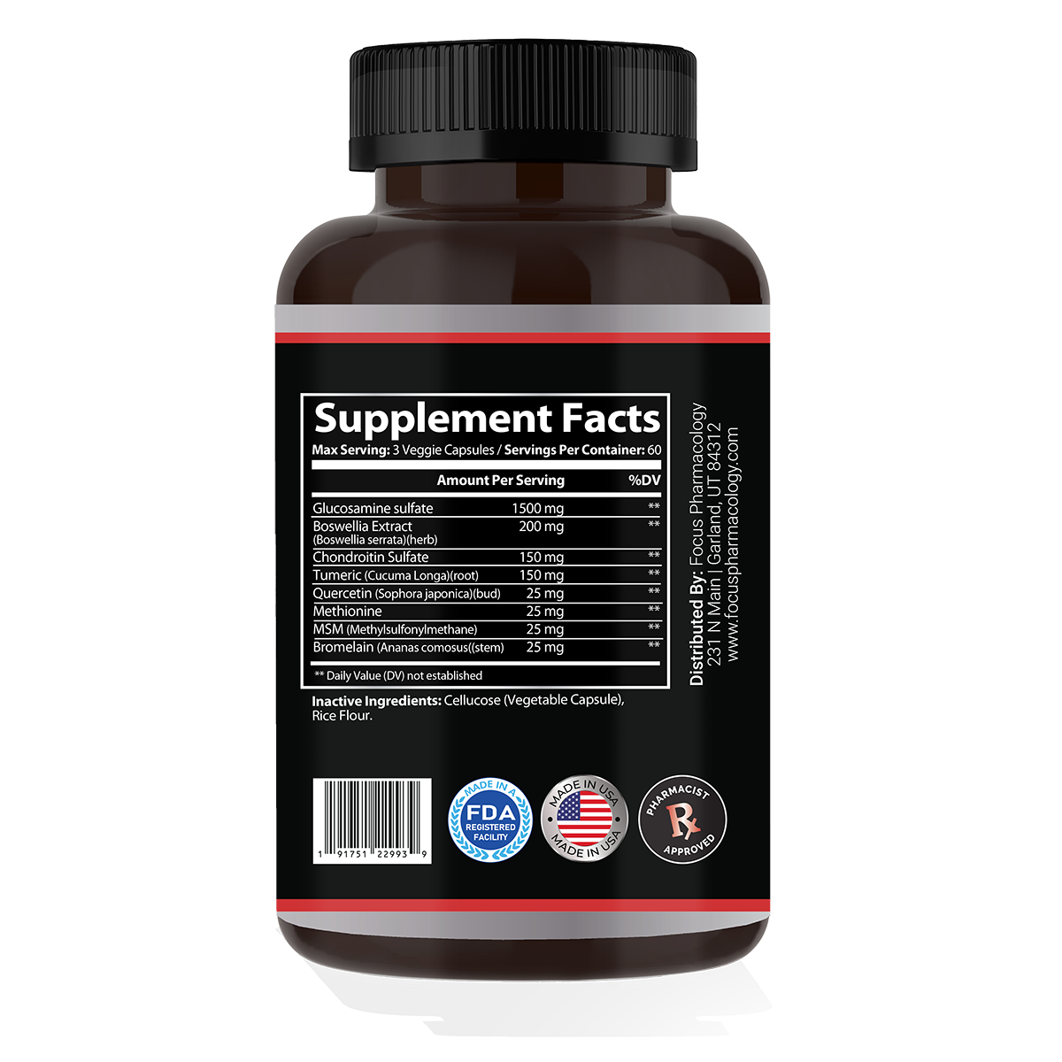 Some of the key ingredients include Glucosamine Sulfate, Boswellia Extract, Chondroitin Sulfate, Turmeric, Quercetin, Methionine, MSM, Bromelain.