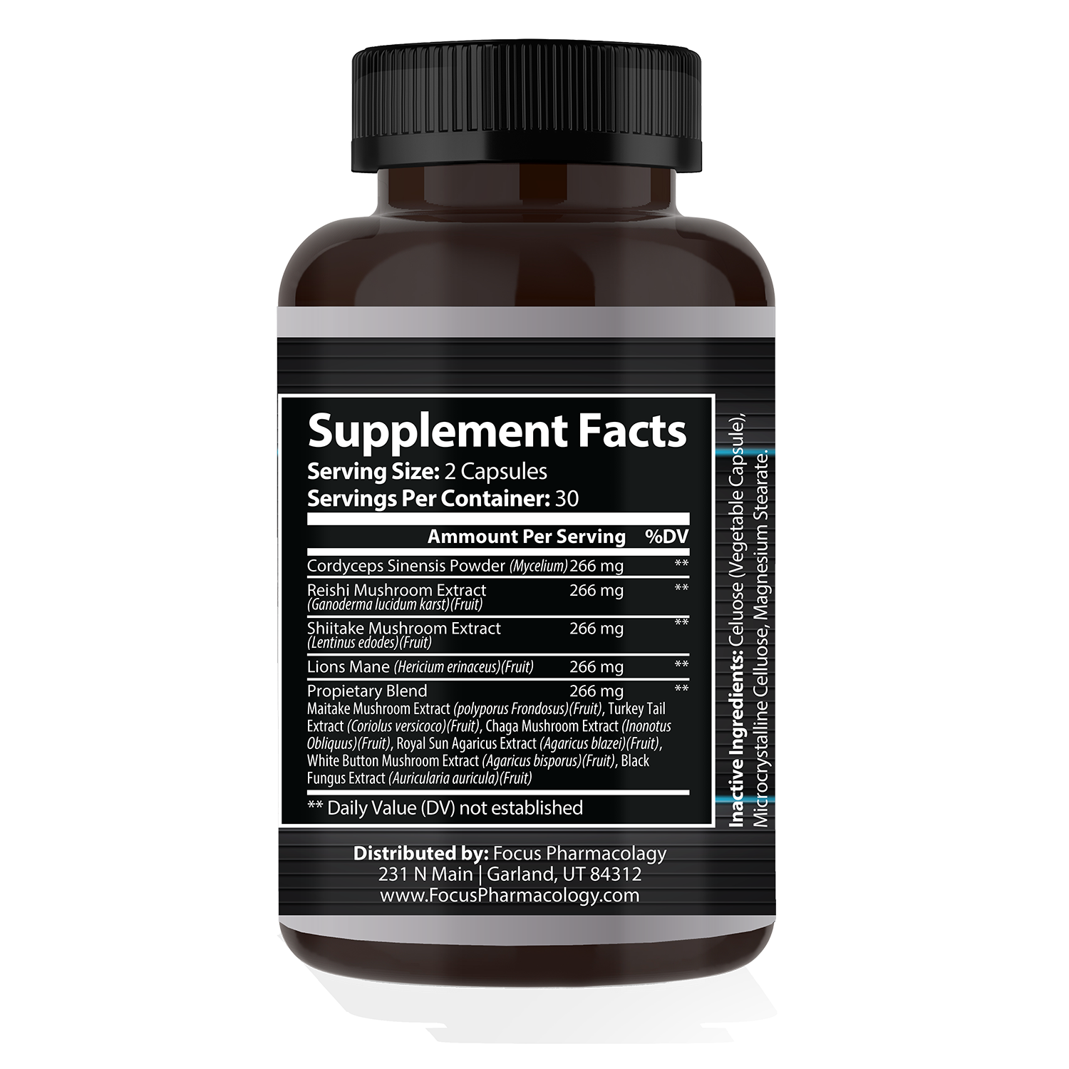 Focus Pharmacology Mushroom supplements are on the rise of becoming more popular. Our formula is beyond competition with 10 different types of mushroom powders and extracts for a successful formula. Some of these ingredients include chaga, cordyceps, reishi and lion's mane. Focus Pharmacology has many benefits but some of the most expressive ones are energy, cognitive function, and an antioxidant boost. It also helps support brain health, energy levels, and immune health.