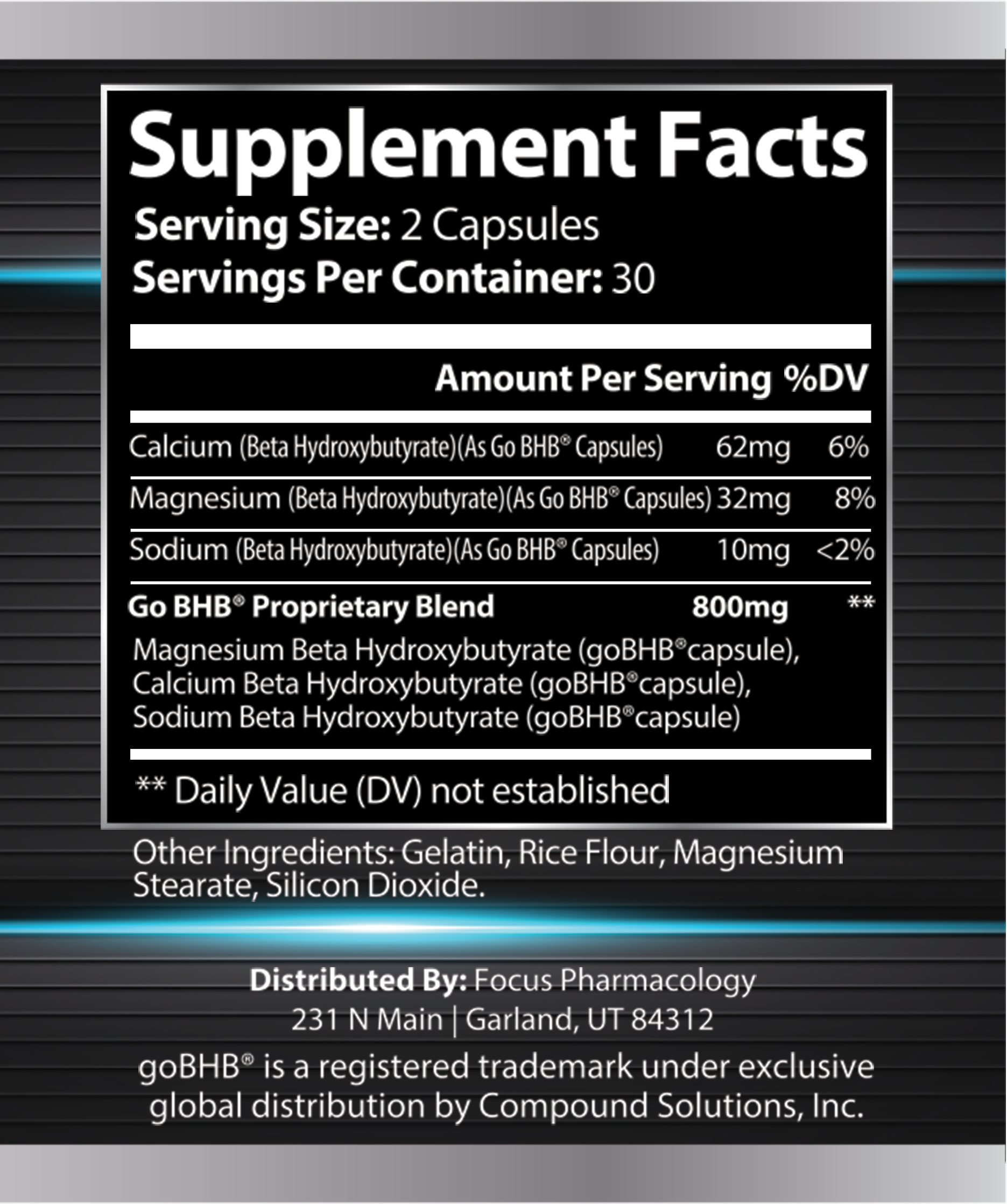 The Focus Pharmacology Keto BHB contains beta-hydroxy-butryate. BHB is detected by the body as a sign that the body is starving. The body responds to the presence of this compound by turning on starvation mode systems that activate the consumption of fat, and activate the consumption of ketone bodies for fuel. Some of the benefits include enhanced fat burning, and more energy in the brain to support focus.