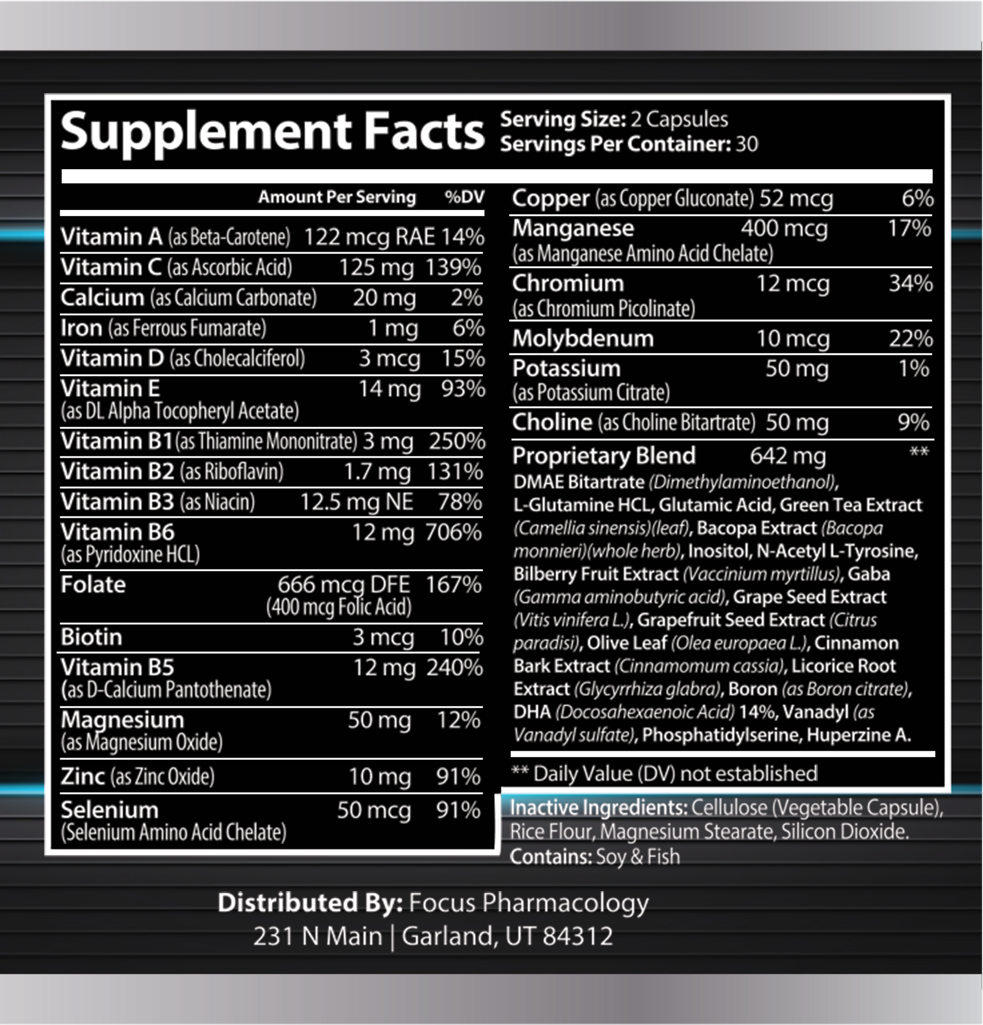 Focus Pharmacology Mind Health formula combines all the major ingredients of a multivitamin with a blend of neurotransmitters, herbs, and fatty acids all with the intent of improving mental function and activity. This means better focus, memory, and cognition. When your body is depleted of vitamins and minerals, every cell in your body is operating metabolically slower and the most active cells are the most affected. The brain is one of THE most active organs in your body consuming nearly 25% of all oxygen and the more you are concentrating, the harder it works. By keeping brain well supplemented, it has the capacity to work harder and more efficiently. This is the single most popular product in the focus pharmacology lineup and is met with universal praise.