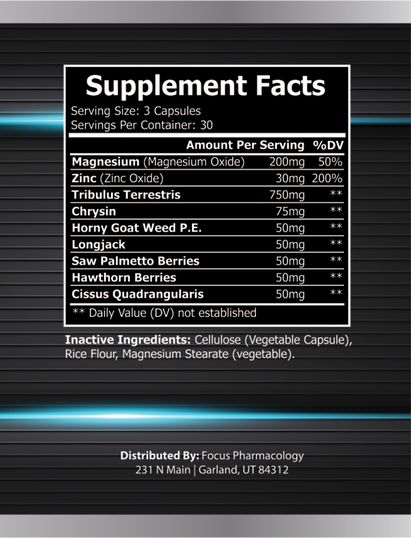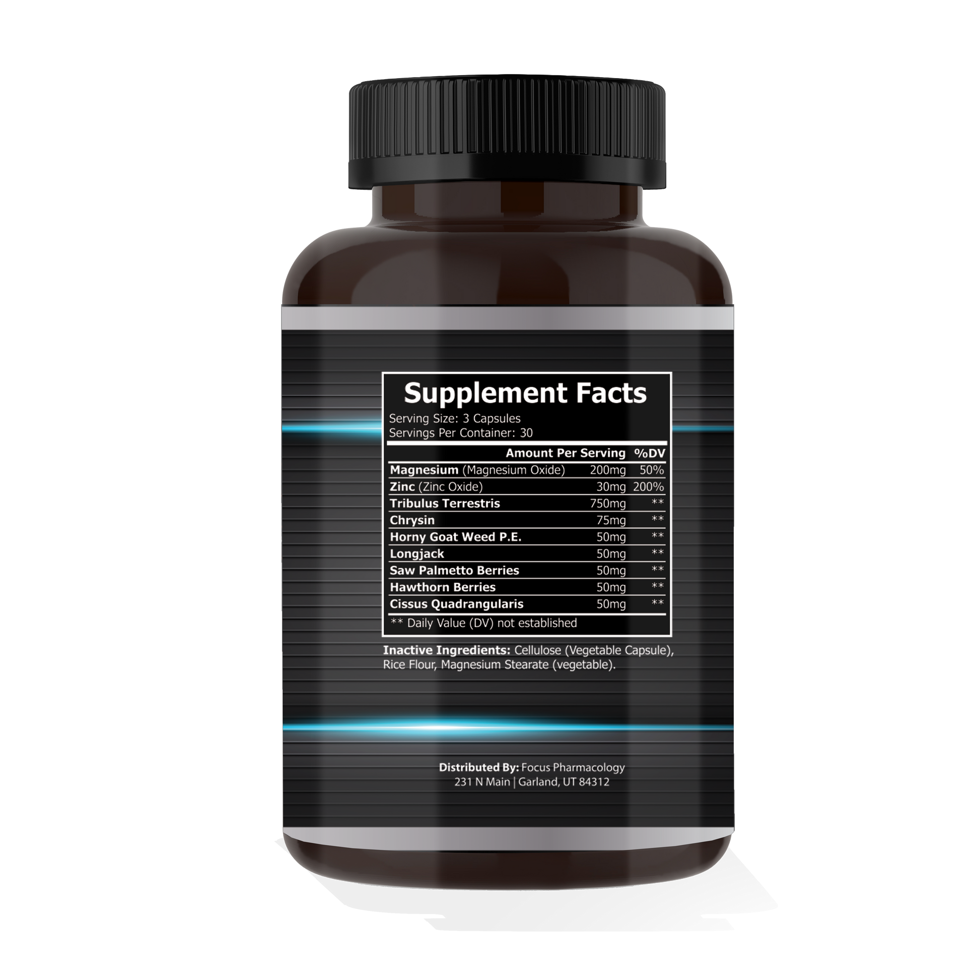 Magnesium, Zinc, Tribulus Terrestris, Chrysin, Horny Goat Weed, Longjack, Saw Palmetto Berries, Hawthorn Berries,and Cissus Quadrangularis.