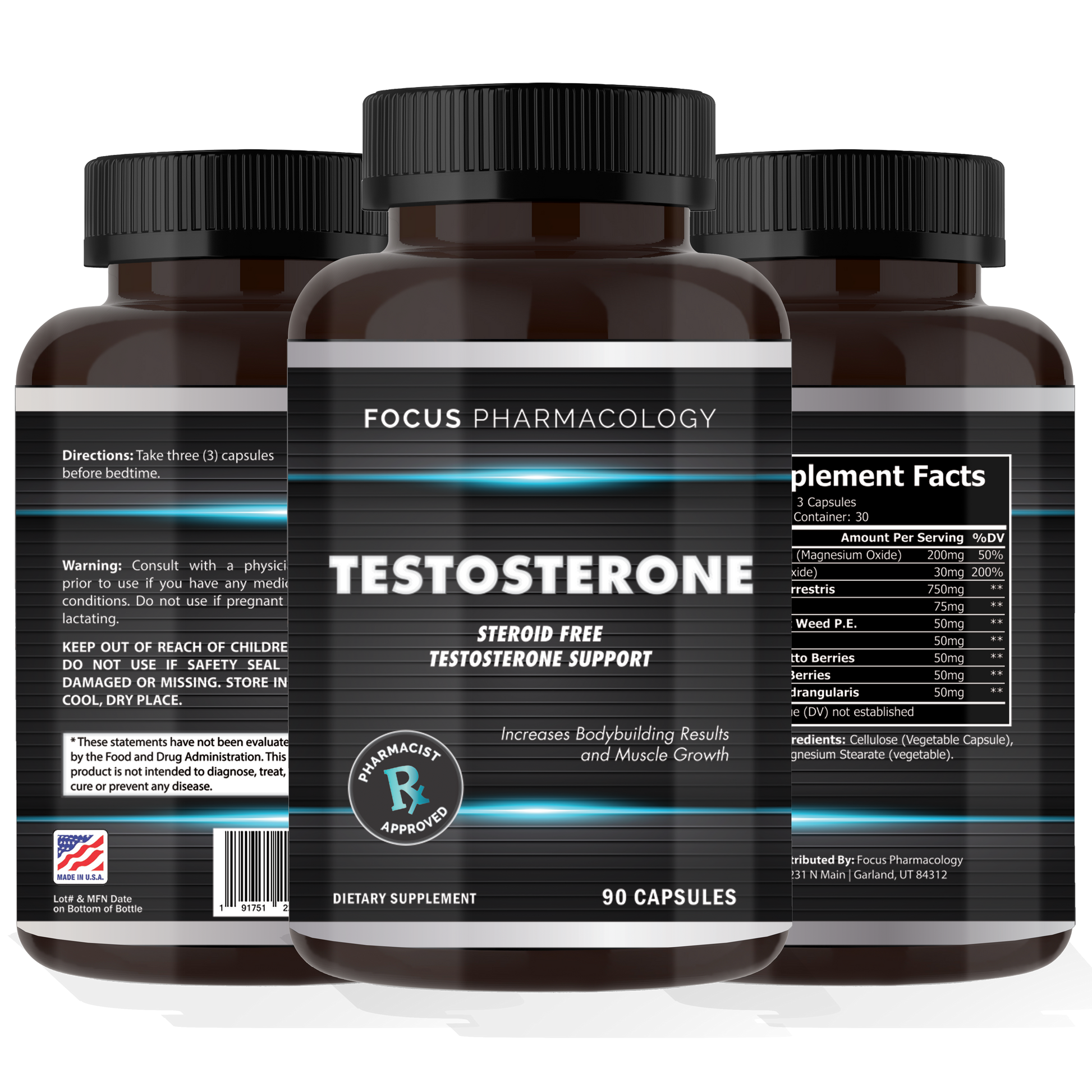Testosterone levels in the blood in both women and men peak in their 30s and decline with age and may be one of the biggest contributors to "aging". This supplement is recommended for both man and women. Focus Pharmacology testosterone supplement combines 7 herbs published in the scientific literature as having a measurable impact on testosterone levels in the body. Testosterone is the hormone which is responsible for the vitality, muscle growth, energy and overall growth of the human body. If you do an intense workout for 45 minutes, your body’s testosterone levels should be at a considerable figure so that the body’s ruptured and damaged tissues can easily recover and build new strands of protein to strengthen the muscles. If your body is not generating enough testosterone, you can face a wide array of problems including obesity, reduced sexual desire/satisfaction, reduced energy, poor mood, longer recovery periods after work outs, and much more. All of this can severely affect the quality of your life style. People who face obesity often have lower testosterone levels in their bodies than the average healthy man.