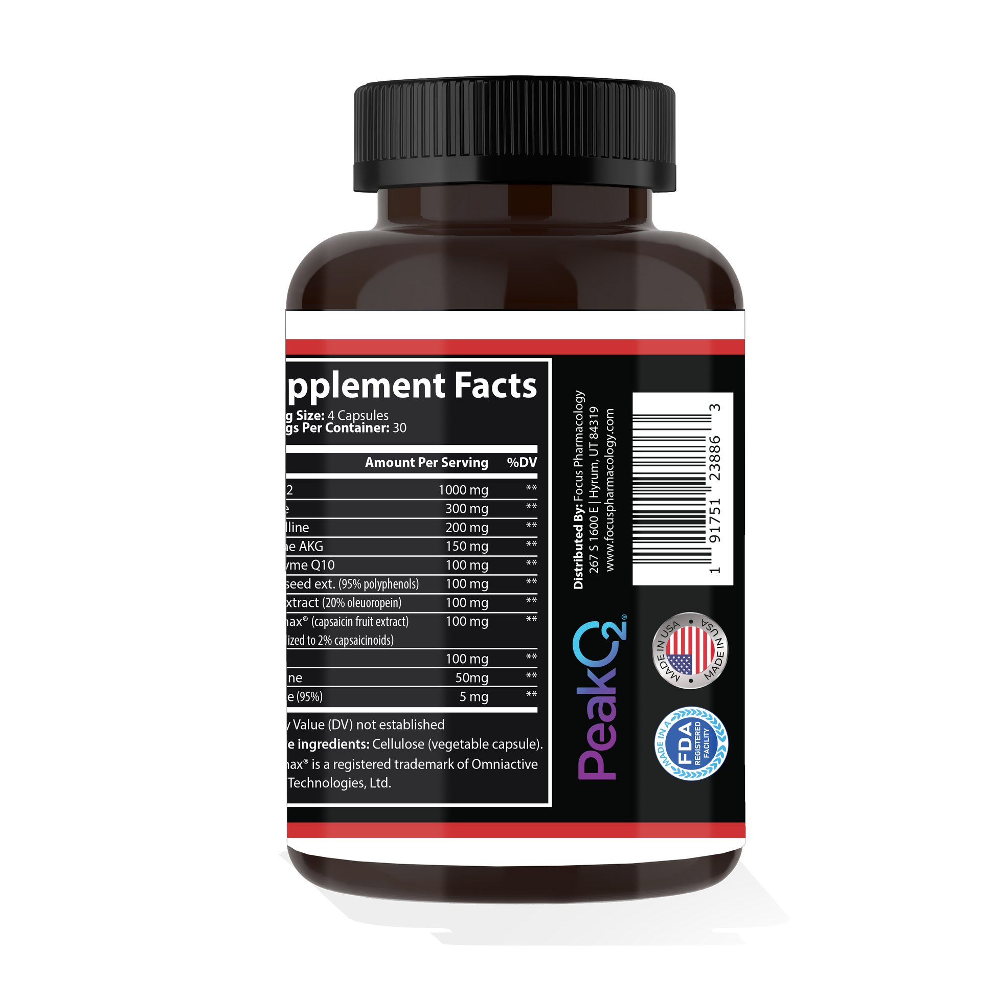 S7, Norvaline, Coenzyme Q10, Piperine, Peak O2 Mushroom Blend, Grape Seed Extract, Green Tea Extract Standardized to 45% EGCG, Arginine AKG, Oleuoropein (hydroxytyrosol precursor), L-Citrulline, Taurine, Capsimax (Capsaicin)