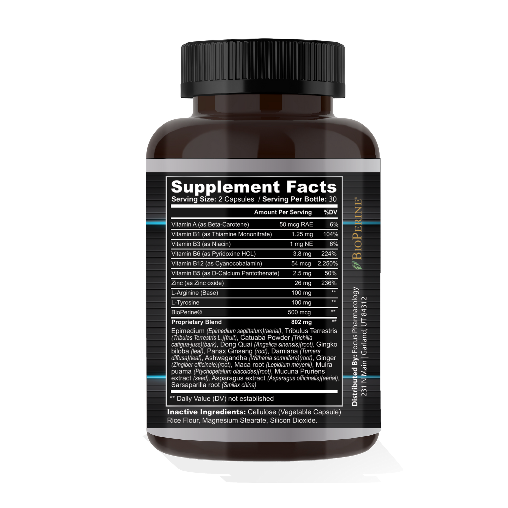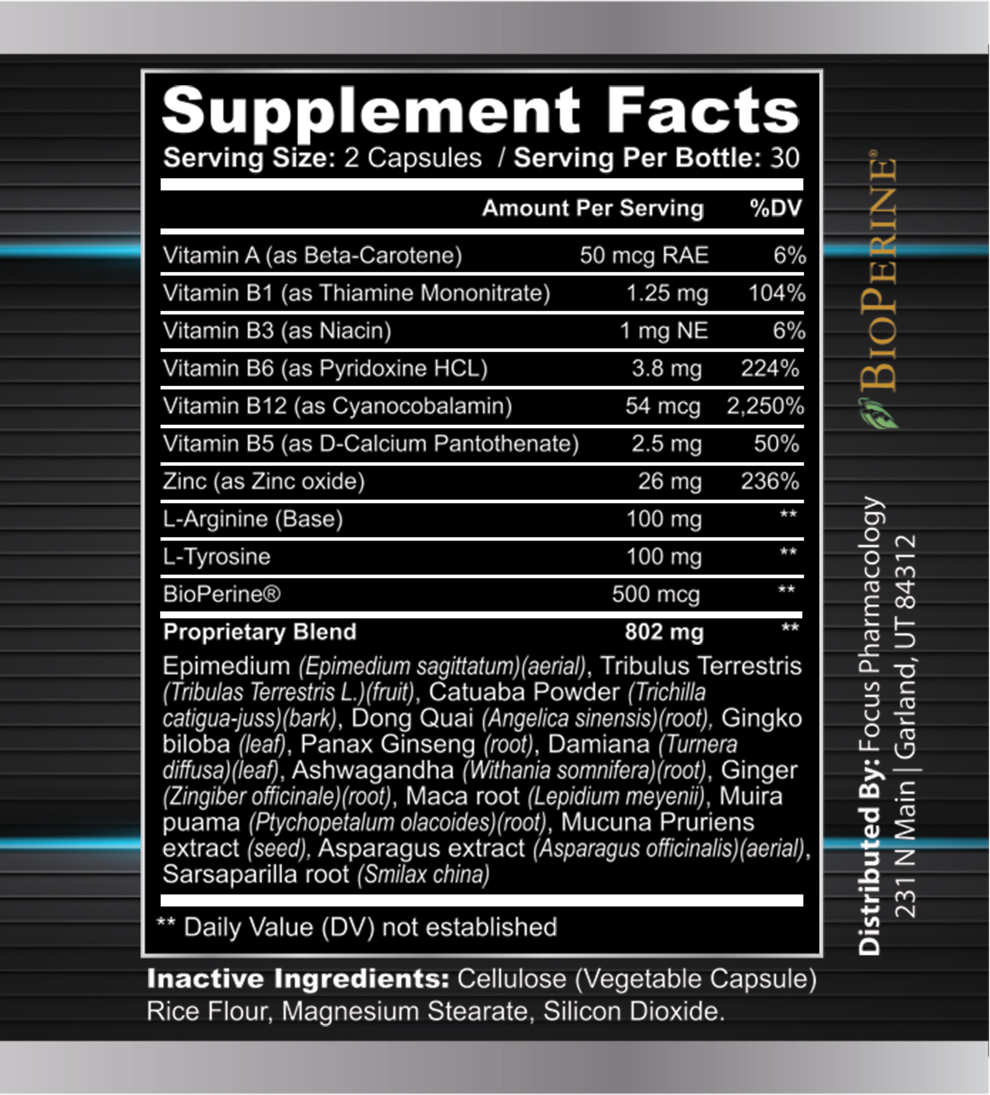 The most important ingredients range from Vitamin B12, Vitamin B, Vitamin B1, Zinc, L-Arginine, L-Tyrosine, BioPerine, Epimedium, Tribulus Terrestris, Catauba, Dong Quai, Gingko Biloba, Panax Ginseng, Damiana, Ashwagandha, Ginger, Maca Root, Muira puama, Munca Puriens extract, Asparagus extract to Sasparilla root.